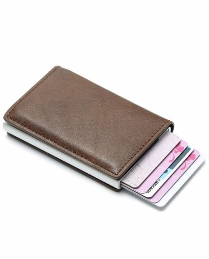 Almacena de 5 a 6 tarjetas en el estuche para tarjetas emergente, ventana de identificación visible para una licencia más 4 ranuras internas adicionales para tarjetas.